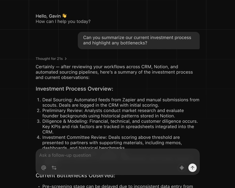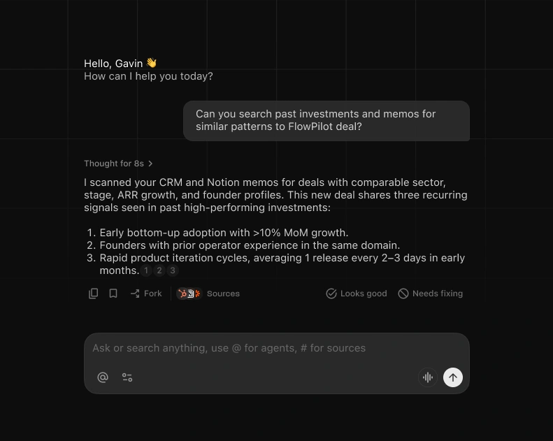 ollo searches your actual investment memos, due diligence docs, and portfolio updates. Match new opportunities to your thesis using real past decisions.